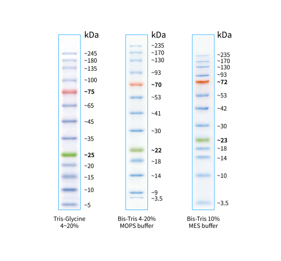 本產(chǎn)品由跨度從 5-245 kDa 的 13 種高度純化預(yù)染的重組蛋白質(zhì)組成,各條帶濃度約為 0.1-0.4 mg/ml。其中 25 kDa 條帶為綠色預(yù)染條帶,75 kDa 條帶為紅色預(yù)染條帶,方便判斷各個(gè)條帶的準(zhǔn)確位置。本產(chǎn)品適合作為 SDS-PAGE 電泳時(shí),變性蛋白樣品的分子量參照,并可實(shí)時(shí)觀察蛋白樣品的電泳分離狀況,也可用于檢測 Western blot 的轉(zhuǎn)膜效率。由于共價(jià)結(jié)合的染料會(huì)影響蛋白質(zhì)分子的電泳遷移率,本產(chǎn)品僅適于粗略地估計(jì)目的蛋白樣品的分子量。