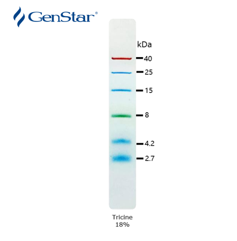 本產(chǎn)品包含了 2.7-40 kDa 的 6 種高度純化并預染的重組蛋白質(zhì)。6 種條帶分別為:2.7、4.2、8、15、25、40 kDa。其中 8 kDa 條帶為綠色預染條帶,40 kDa 條帶為橙紅色預染條帶,方便判斷各個條帶準確位置。