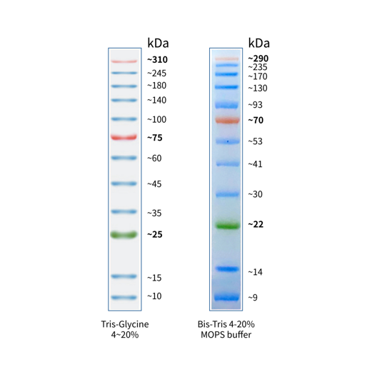 本產(chǎn)品由跨度從 10-310 kDa 的 12 種高度純化預染的重組蛋白質(zhì)組成,各條帶濃度約為 0.1-0.4 mg/ml。其中 25 kDa 條帶為綠色預染條帶、75 kDa 和 310 kDa 條帶為紅色預染條帶,方便判斷各個條帶的準確位置。本產(chǎn)品適合作為 SDS-PAGE 電泳時,變性蛋白樣品的分子量參照,并可實時觀察蛋白樣品的電泳分離狀況,也可用于檢測 Western blot 的轉(zhuǎn)膜效率。由于共價結(jié)合的染料會影響蛋白質(zhì)分子的電泳遷移率,本產(chǎn)品僅適于粗略地估計目的蛋白樣品的分子量。