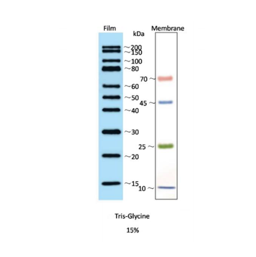 本產(chǎn)品由跨度從 10-200 kDa 的 14 種純化的天然蛋白混合而成。其中 25 kDa 條帶為綠色預染條帶、10 kDa 和 45 kDa 條帶為藍色預染條帶、70 kDa 條帶為粉色預染條帶,便于動態(tài)觀察電泳狀態(tài),方便判斷各個條帶的準確位置和轉膜效果。其他 10 條條帶含有多種 IgG 亞型結合位點,可以和目的蛋白條帶同時結合抗體,用相同抗體來檢測,經(jīng)化學發(fā)光檢測或者通過 CCD 成像后顯示 15 kDa、20 kDa、30 kDa、40 kDa、50 kDa、60 kDa、80 kDa、100 kDa、150 kDa、200 kDa 條帶。