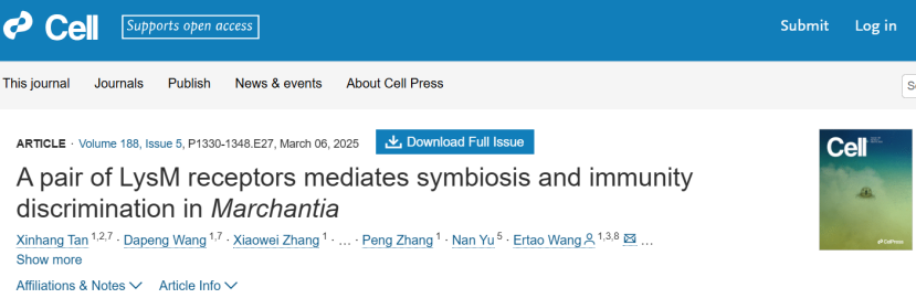 1. Xinhang Tan,Dapeng Wang,Xiaowei Zhang,et al. A pair of LysM receptors mediates symbiosis and immunity discrimination in Marchantia. Cell. 2025.Mar. IF=45.6